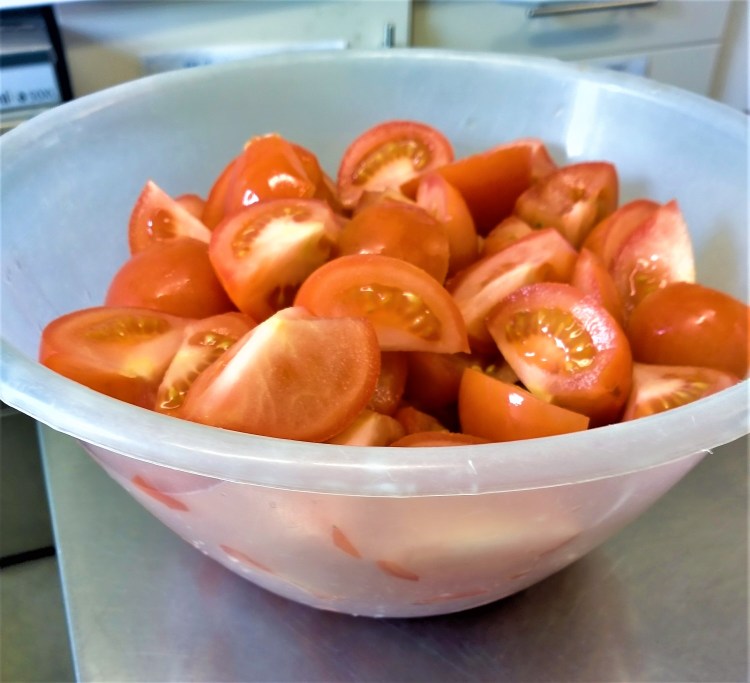 Chop the tomatoes into quarters and set aside.