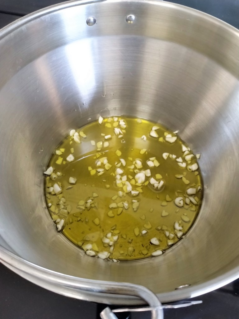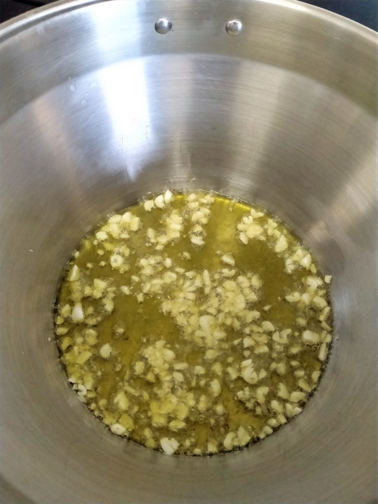 Chop or crush the garlic and fry in a high-sided pan with olive oil for a couple of minutes at a medium high heat. Using a saucepan instead of a frying pan will help keep the water in the mixture and stop it from drying and burning.