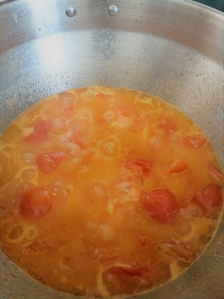 Next, add the tomatoes to the pan and fry them for a further 5 minutes. Add the rest of the ingredients and lower it to low/medium heat.