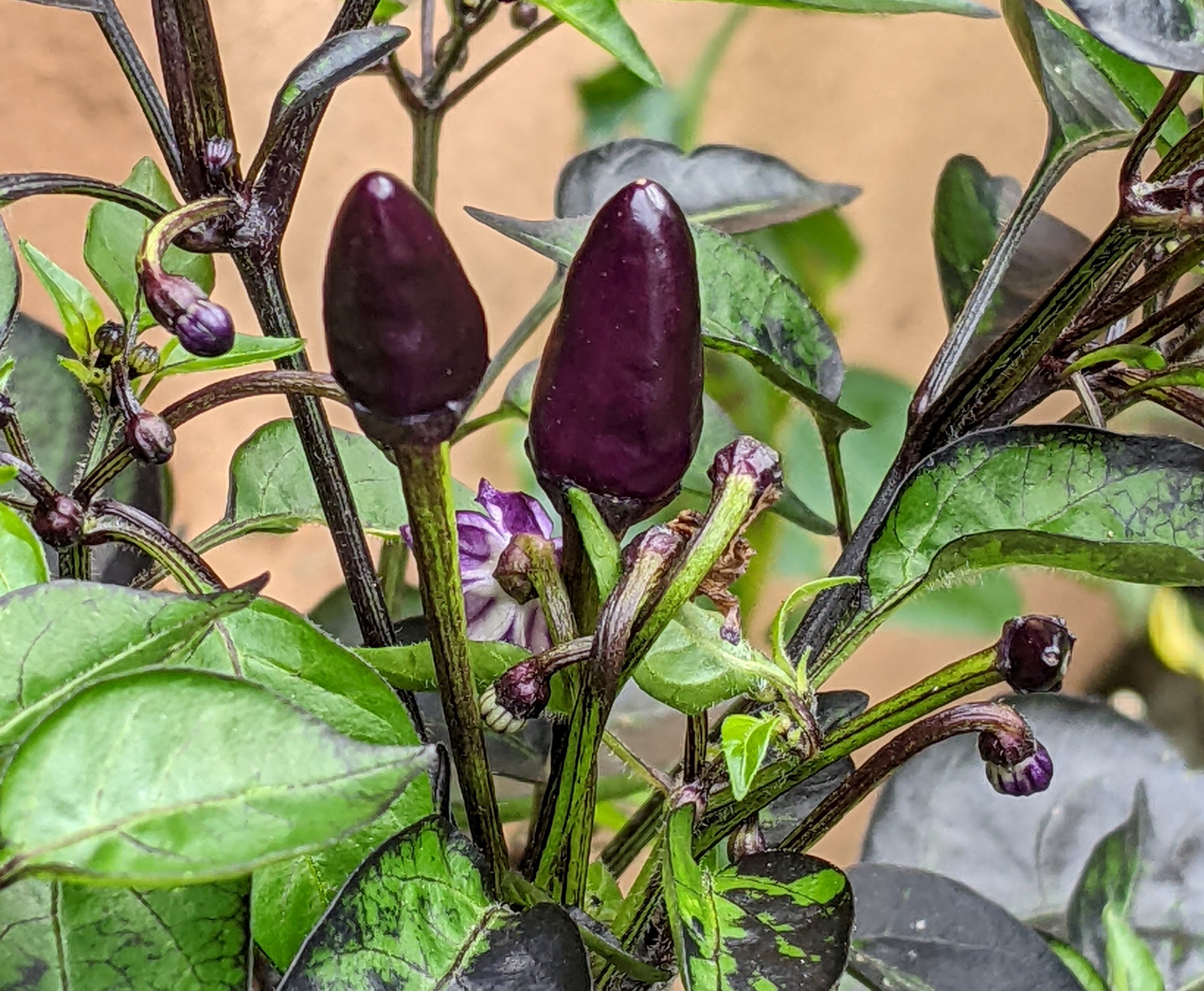 Explosive Ember (pictured right) – with beautiful purple leaves and flower – the chillies start off purple too, but ripen to red and are quite small. The plant is compact, so a good one to grow indoors on a sunny windowsill. Medium heat (40,000 SHU) 4-20x hotter than a Jalapeño.
