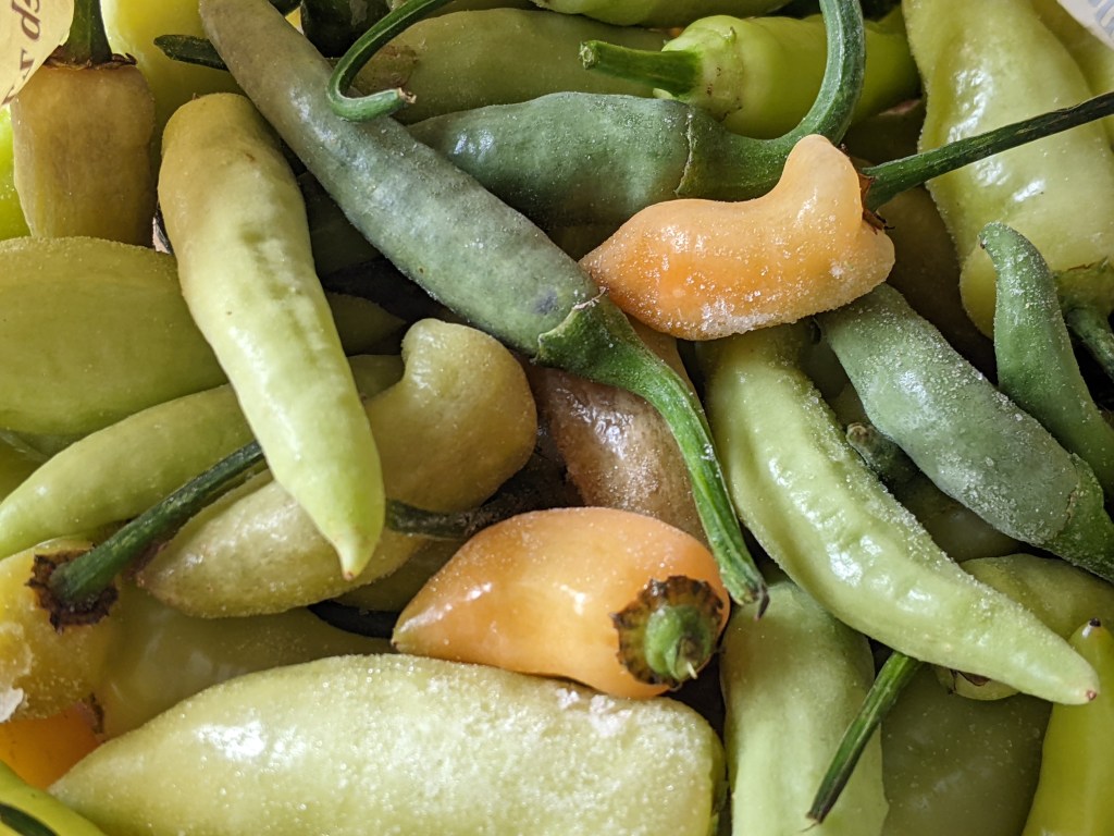 I use chillies in almost every meal, especially in winter to spice up soups. I freeze most of mine to preserve them – this is a pic of my current frozen stash, just washed then popped in a freezer bag.