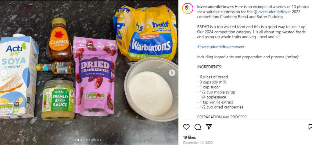 Oxford Brookes University’s Instagram handle featuring a digital cooking competition using stock items, specifically bread, to cook cranberry bread and butter pudding