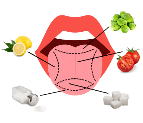 The five tastes are bitter, savoury (or Umami), sweet, salty and sour as shown clockwise in the image. Taste buds are present all over your tongue in tiny bumps called papillae, as well as as on the roof of your mouth and in your throat. They all detect the five different tastes, but some areas of the tongue are particularly sensitive to specific tastes. For example, the back of tongue is more sensitive to bitter flavours. This is likely an evolutionary safety mechanism to prevent us from swallowing poisonous substances that often taste bitter.